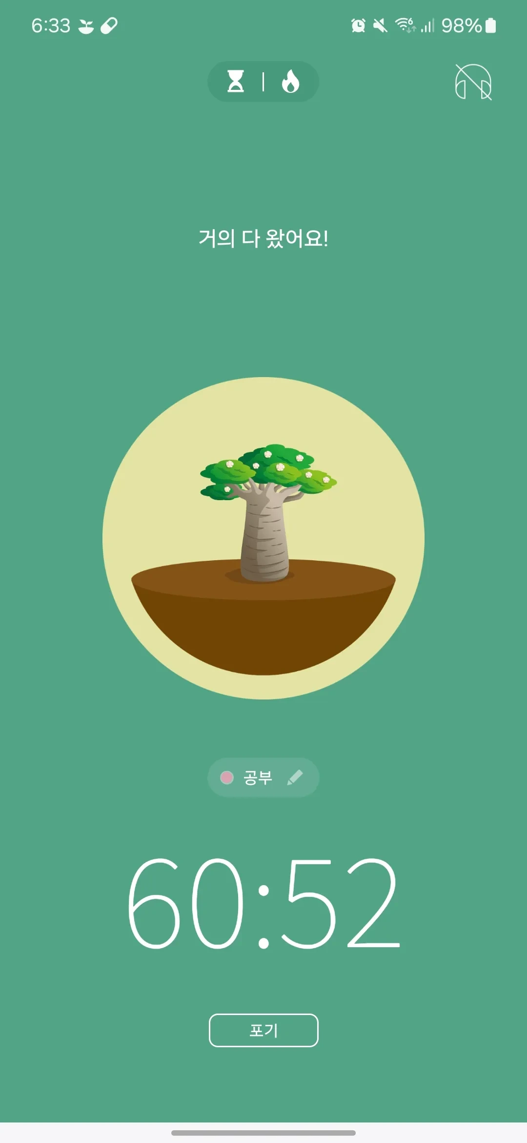 앱 켜고 집중하면 나무가 자라고, 중간에 폰 만지면 나무가 죽어.